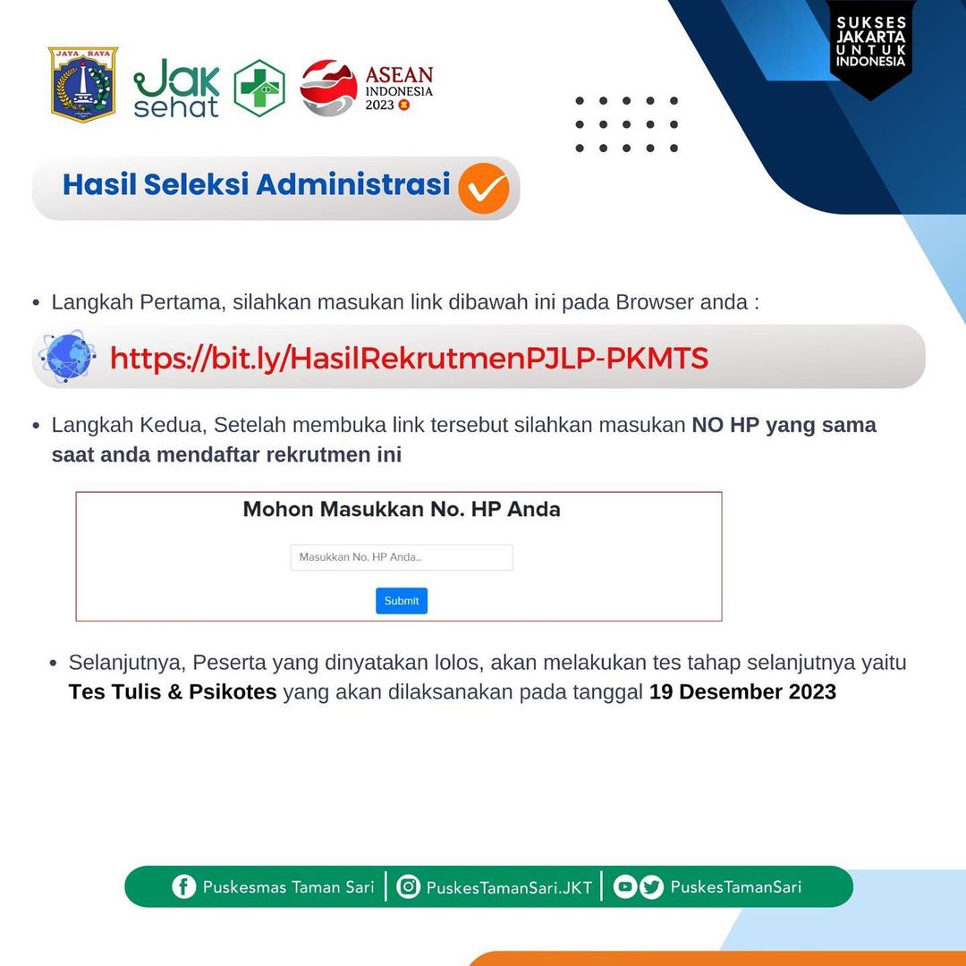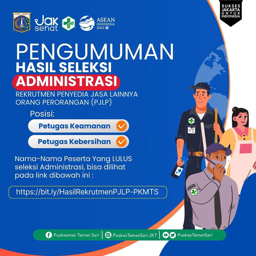 Pengumuman Hasil Seleksi Administrasi PJLP Tahun 2024 Puskesmas Taman Sari